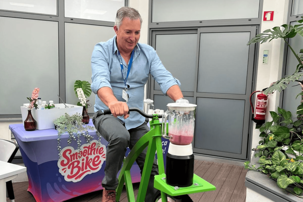 A WorkWell levou as Smoothie Bikes por todo o país, visitando todas as delegações do IMT. Esta experiência permitiu aos colaboradores preparar os seus próprios batidos de frutas pedalando, promovendo bem-estar, alimentação saudável, energia e interação entre equipas, transformando as pausas do trabalho em momentos ativos e divertidos.